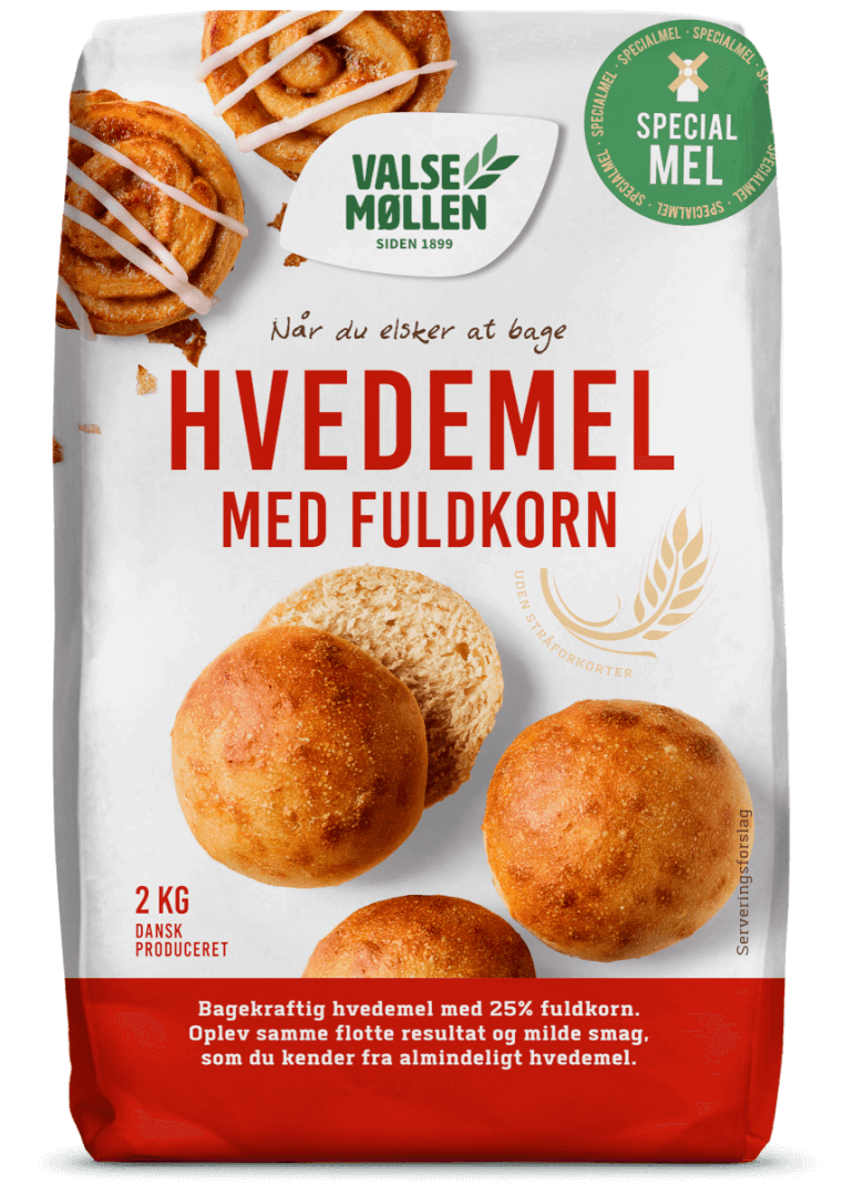 Bage kraftig hvedemel med 25% fuldkorn. Oplev samme flotte resultat og milde smag, som du kender fra almindeligt hvedemel.