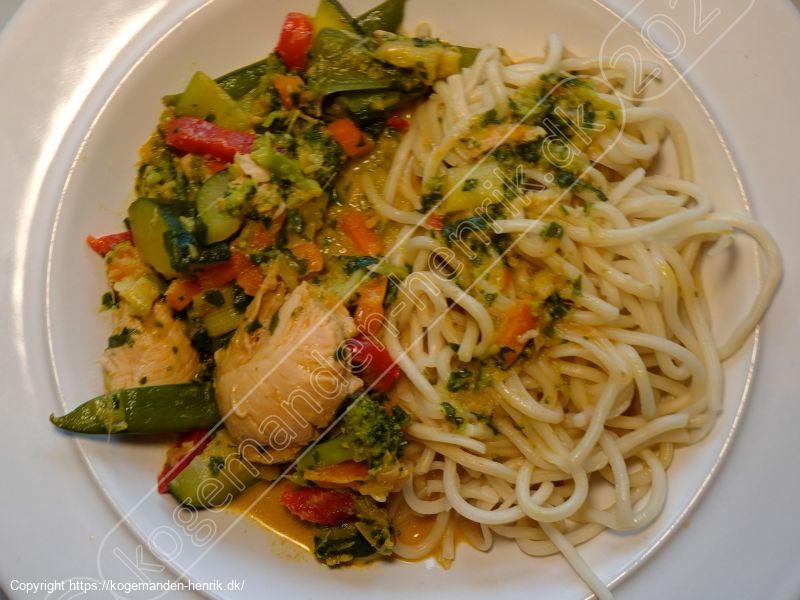 Samling af retten: Tilsæt kokosmælken til gryden med kyllingen og lad det simre i yderligere et par minutter. Bland det hele sammen med de tilberedte grøntsager i wokken.