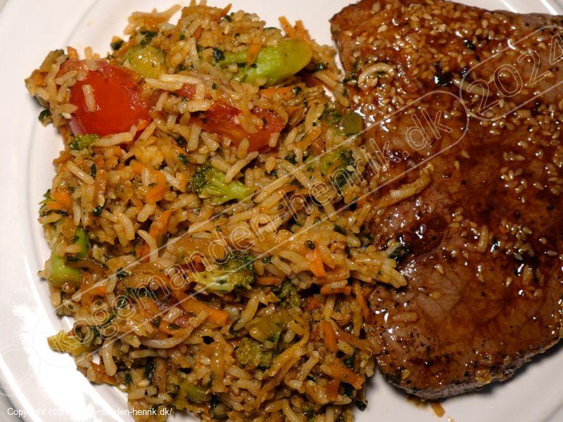 Servering: Anret de stegte ris med grøntsagerne på en tallerken ved siden af bøffen. Drys eventuelt lidt sesamfrø over bøffen for ekstra smag og tekstur.